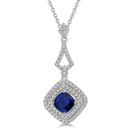 Davis Classics 14k White Gold Vintage Double Halo Sapphire and Diamond Pendant Necklace