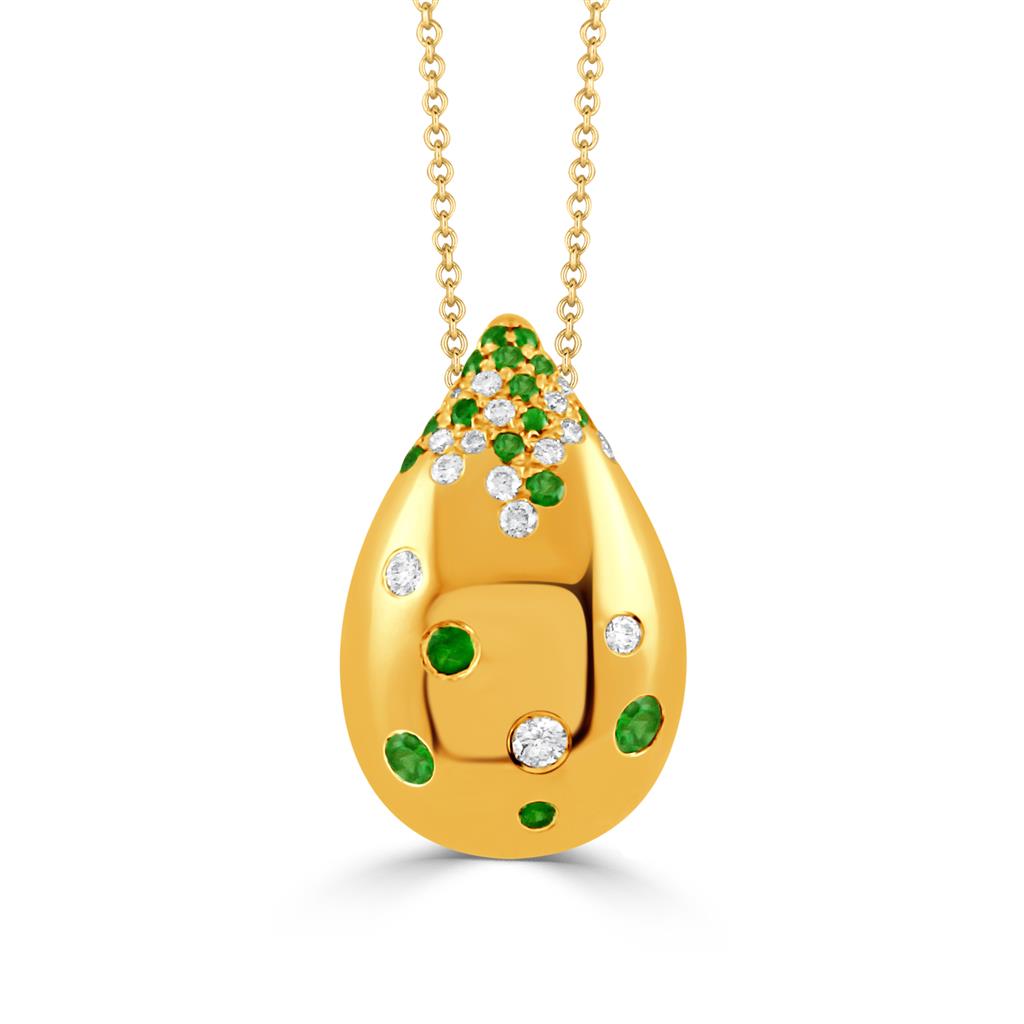 Pouf Collection Tsavorite & Diamond Teardrop Pendant Necklace crafted in 18k yellow gold, featuring a distinctive teardrop pouf design. This elegant pendant is set with (17) pavé set natural round Tsavorites totaling 0.25 grams, accented by (16) pavé set round brilliant cut diamonds weighing 0.17 carats total weight, graded G/H color, SI1 clarity. Suspended from an adjustable 16–18" chain and secured with a lobster clasp, this piece offers vibrant green brilliance paired with refined diamond sparkle.