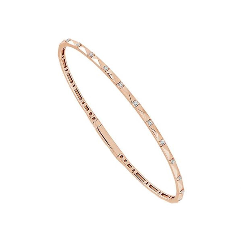 Elegant and versatile, this 14k rose gold and titanium diamond cut bangle from the Davis Signature Flexie Collection features 13 prong-set round brilliant cut diamonds, totaling 0.17 carats of I/J color and I1 clarity. Designed for a flexible, comfortable fit, this 6.75" bangle is secured with a locking push clasp, offering a seamless blend of sophistication and practicality for everyday wear or special occasions.
