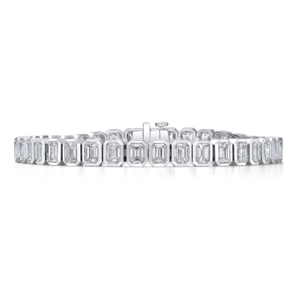 This exquisite platinum 7-inch bracelet features 39 North/South bezel-set emerald-cut diamonds, totaling 13.19 carats with G/H color and VS1 clarity. The sleek bezel settings highlight the sophisticated geometry of each diamond, creating a seamless display of brilliance. Secured with a safety lock tongue clasp, this timeless bracelet is a statement of refined luxury and elegance.