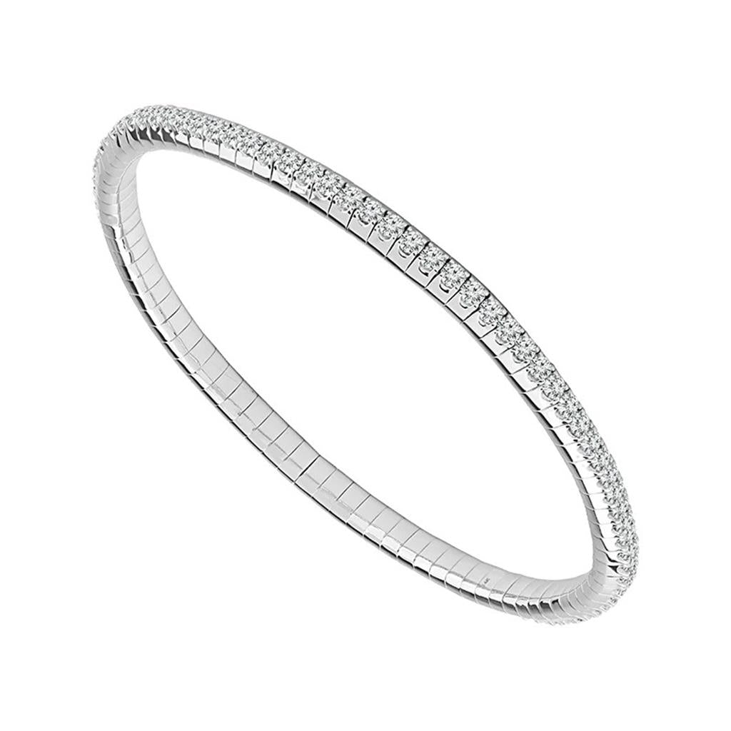 From the Davis Signature Flexie Collection, this radiant 14k white gold bangle is engineered with a titanium wire core, providing exceptional flexibility, durability, and comfort. The design is adorned with 86 prong-set round brilliant-cut diamonds totaling 1.75 carats, each shimmering with I/J color and I1 clarity to create a luminous ribbon of sparkle. Measuring 6.75 inches and secured with a locking push clasp, this bracelet blends advanced craftsmanship with timeless elegance, making it a refined and luxurious addition to any jewelry collection.