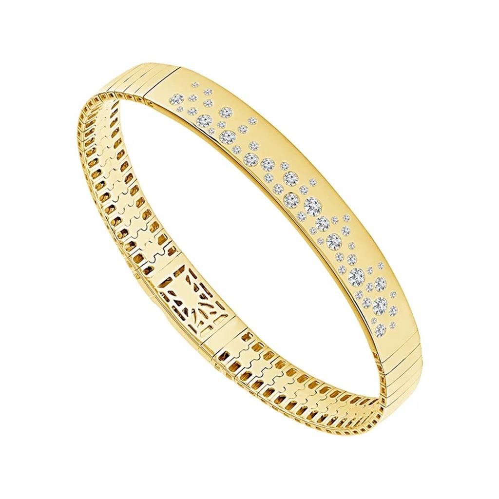 From the Davis Signature Flexie Collection, this bold 14k yellow gold wide bangle is crafted with a titanium wire core for exceptional flexibility, durability, and comfort. The sleek, modern design is accented with 51 flush-set round brilliant-cut diamonds totaling 0.75 carats, each shimmering with I/J color and I1 clarity for a refined, understated sparkle. Measuring 6.75 inches and secured with a locking push clasp, this bracelet blends contemporary sophistication with innovative craftsmanship, making it a striking and luxurious addition to any fine jewelry collection.