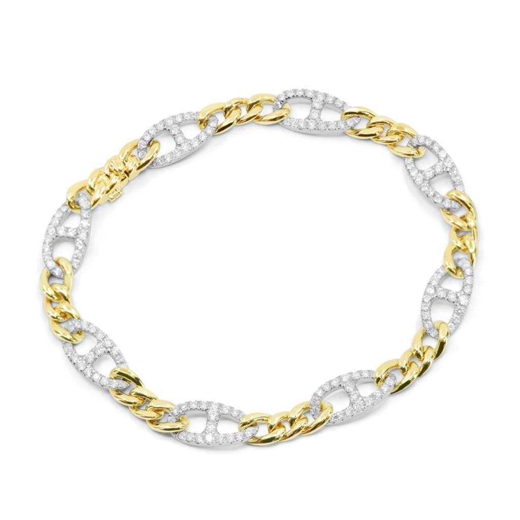 Elevate your elegance with the Madison L 14k yellow and white gold station style curb link diamond bracelet. This exquisite piece features 160 prong-set round brilliant cut diamonds, totaling 1.65 carats, set in a stunning curb link design. The diamonds are of G/H color and SI1-SI2 clarity, ensuring a dazzling display. The bracelet is secured with a safety lock tongue clasp, combining luxury with practicality for a timeless addition to your jewelry collection.