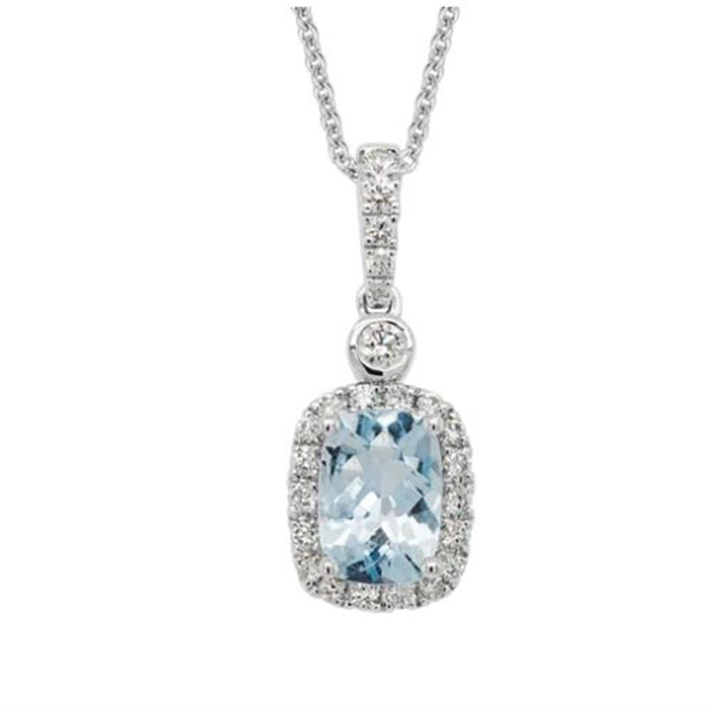 Davis Luxe Collection Aquamarine and Diamonds Halo Drop Necklace in 14k White Gold. Length: 16-18" adj.