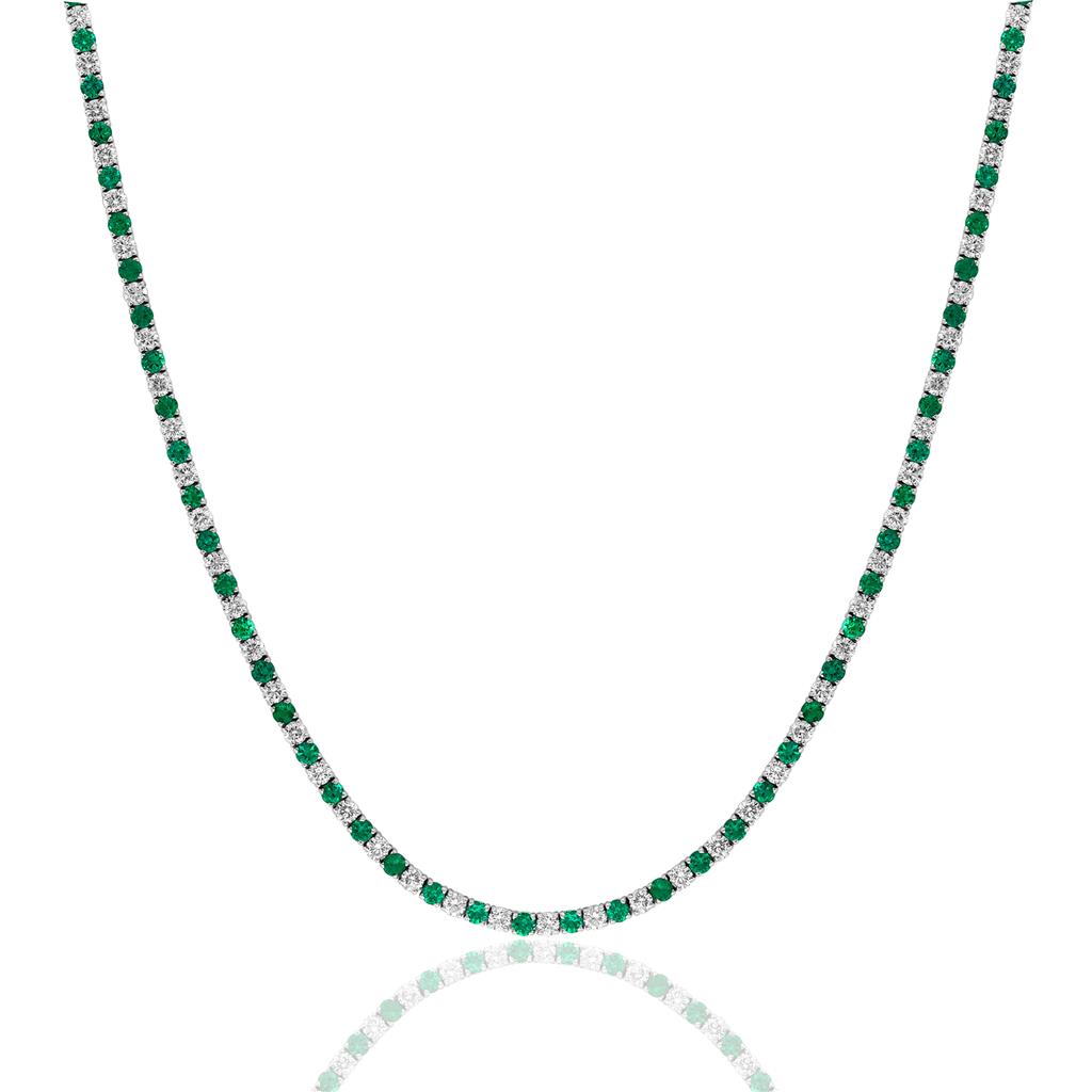 This exquisite 14k white gold 17-inch tennis necklace features 78 prong-set natural round Zambian emeralds, totaling 4.58 carats, alternating with 78 prong-set round brilliant-cut diamonds, weighing 4.37 carats with G/H color and SI1 clarity. Secured with a safety lock tongue clasp, this luxurious design showcases a striking contrast of vivid emerald green and radiant diamond brilliance, making it a timeless statement piece for any fine jewelry collection.