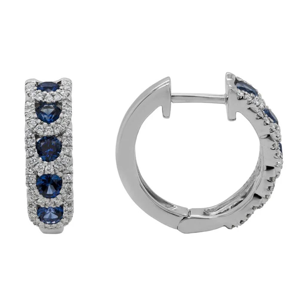 Elegantly crafted in 14k white gold with a radiant rhodium finish, these Davis Classics halo hoop earrings offer a graceful balance of color and sparkle. Measuring 15.6 x 4.6mm, each hoop showcases ten prong-set round blue sapphires, each 2.6mm and totaling 0.85 carats, radiating a deep, regal hue. These vibrant gemstones are encircled by a glittering frame of 106 prong-set round brilliant cut diamonds, weighing 0.28 carats total, with G/H color and SI2 clarity. Complete with locking full closure clasps, these hoops make an exquisite addition to any refined jewelry collection.