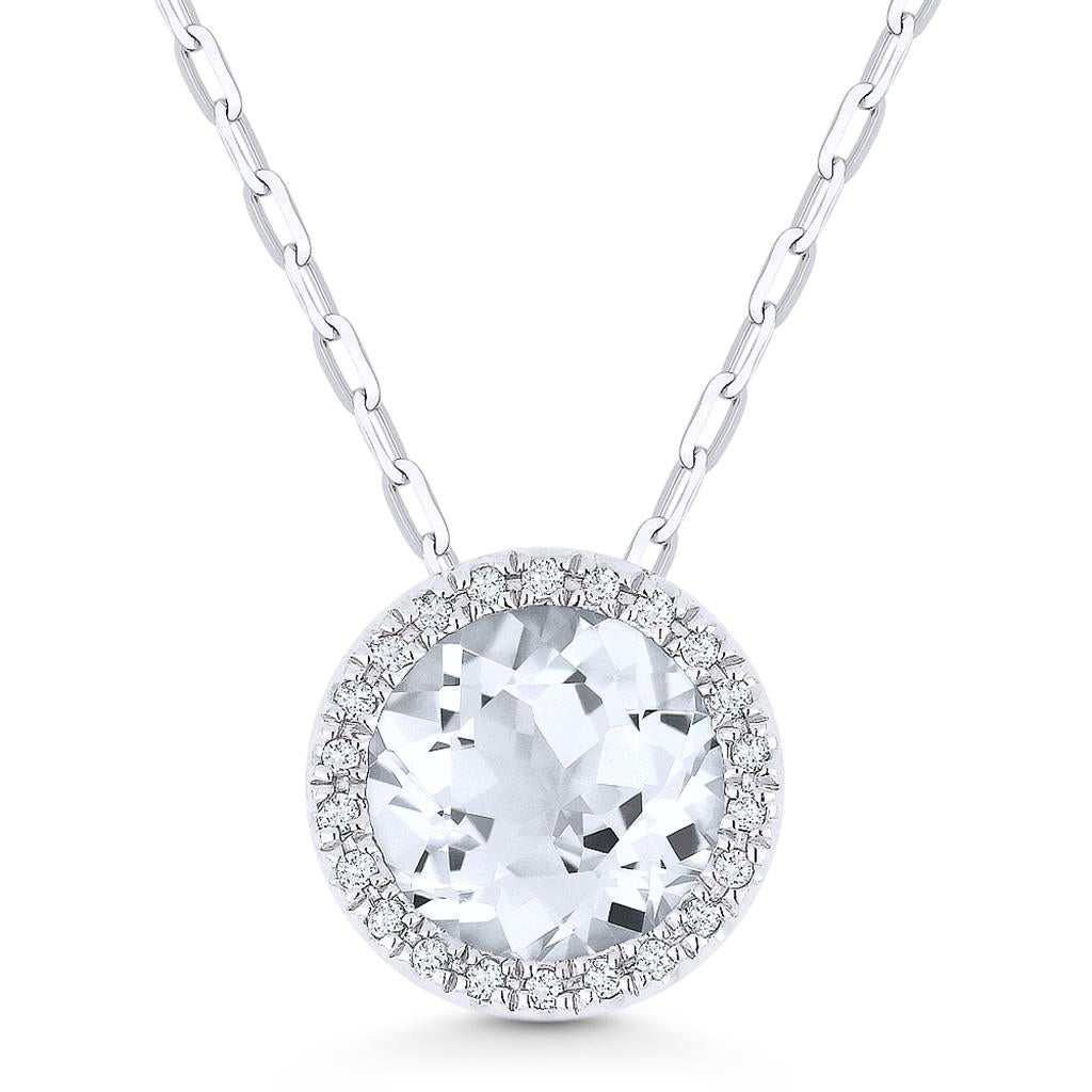 Illuminate your style with the Davis Signature 14k White Gold White Topaz Halo Pendant. This exquisite pendant features a stunning 7mm bezel-set round white topaz center stone, weighing 1.62 carats. The radiant white topaz is beautifully framed by twenty-two pave-set round single-cut diamonds, totaling 0.05 carats, with G/H color and SI2 clarity, creating a brilliant halo effect. Suspended from a 16-inch oval link chain with a secure lobster clasp, this pendant combines timeless elegance with modern sophistication. Perfect for celebrating special moments or adding a touch of refined elegance to your everyday style, this pendant is a beautiful addition to any jewelry collection.