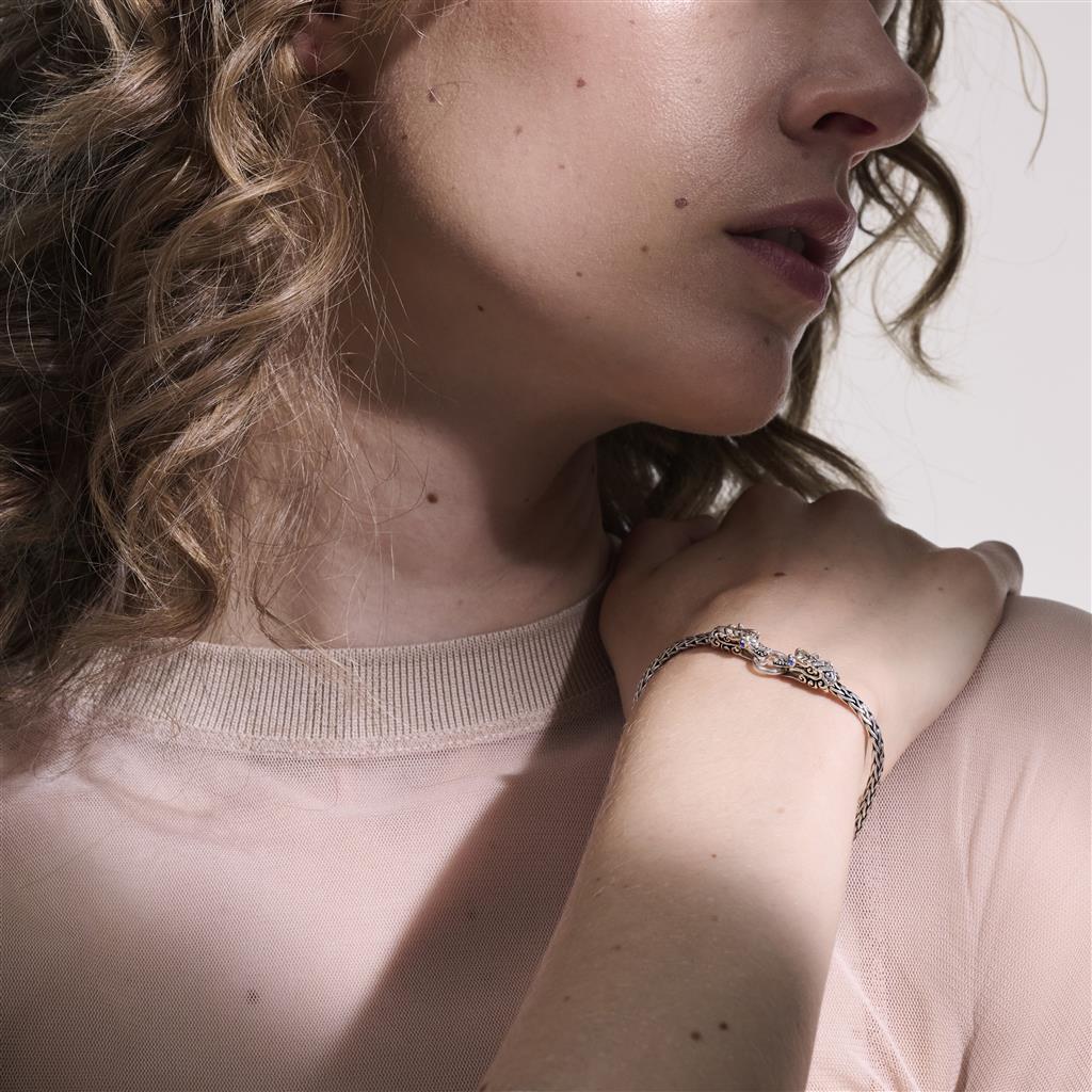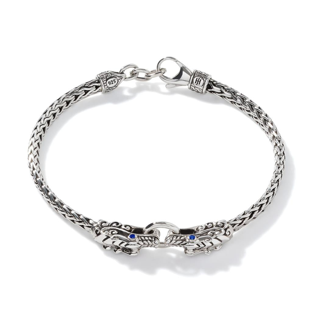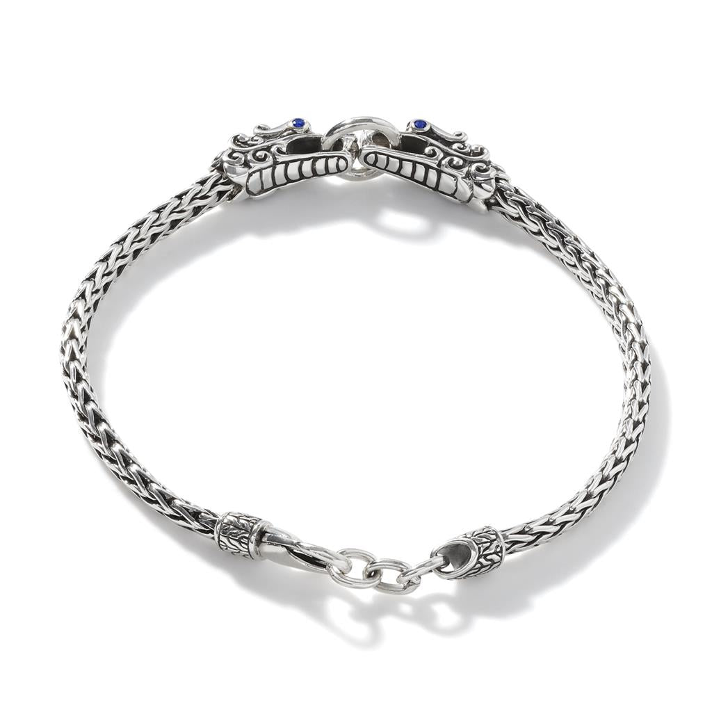 A figurative bracelet featuring John Hardy's hand-carved Naga dragon—a legendary symbol of love, protection and prosperity. Artisan handcrafted in reclaimed sterling silver with blue sapphires. Size medium. Style no. BBS651041BSP