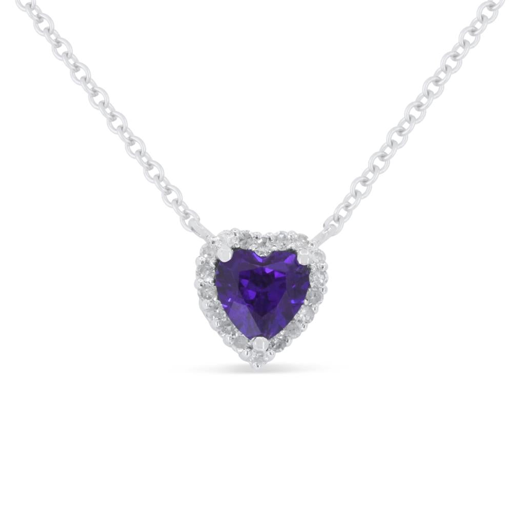This enchanting pendant necklace features a prong set heart shaped Amethyst center, measuring 5 x 5mm and weighing 0.38 carats. The vibrant Amethyst is surrounded by a halo of 18 prong set round brilliant cut diamonds, totaling 0.11ctw, with G/H color and SI2 clarity, adding a sparkling frame to the piece. The pendant hangs on an adjustable 16-18" chain with a secure lobster clasp, offering a romantic and versatile addition to any jewelry collection.