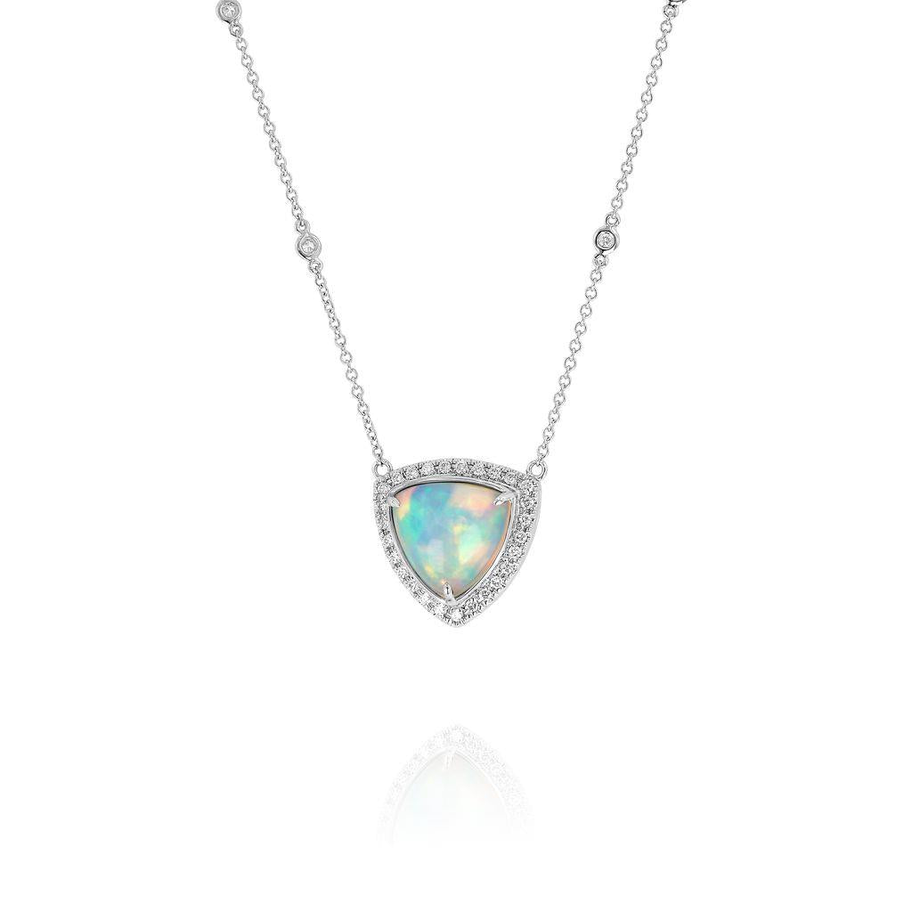This enchanting pendant necklace from Yael captures the mystique of a 3.58ct natural trillian cut Ethiopian White Opal, prong set in a delicate halo of 40 round brilliant cut diamonds. Suspended from an 18-inch “Diamonds by the Yard” chain, the piece is accented with 8 bezel set round brilliant cut diamonds along the length of the chain, bringing the total diamond weight to 0.48ctw of G color, VS1 clarity. Crafted in luminous 18k white gold and finished with a secure lobster clasp, this necklace is a radiant celebration of ethereal color and refined brilliance.