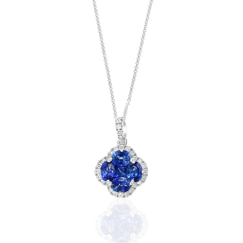 Davis Classics 18k White Gold Blue Sapphire and Diamond Floral Halo Pendant Necklace