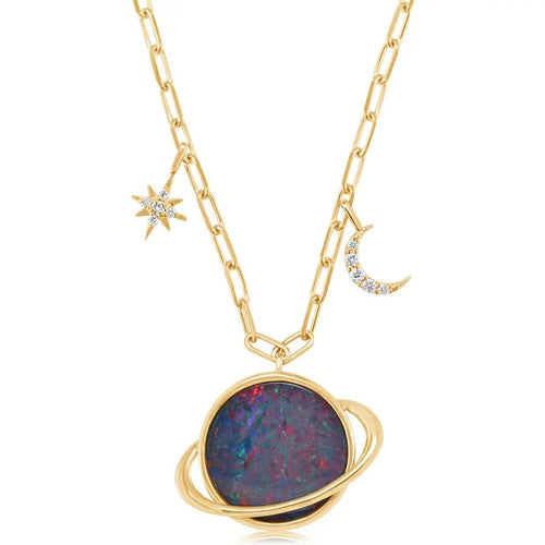 Davis Classics 14k Yellow Gold Australian Opal and Diamond Saturn Pendant Necklace