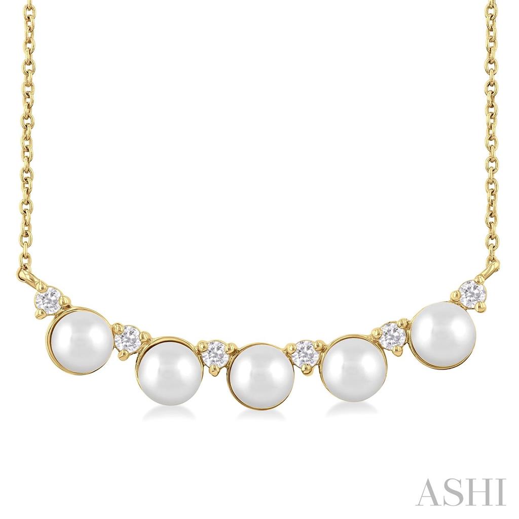 The Davis Classics 10k Yellow Gold Contour Pearl Bar Pendant Necklace is a graceful blend of elegance and modern design. This adjustable 16-18" necklace features a delicate bar pendant adorned with five white freshwater cultured pearls, each measuring 4.5mm. The pearls are beautifully complemented by six prong-set round brilliant cut diamonds, totaling 0.16 carats, with I/J color and SI2-I1 clarity, adding a touch of sparkle to the sophisticated design. The necklace is secured with a spring ring clasp, ensuring both style and ease of wear. Perfect for adding a refined touch to any outfit, this pearl and diamond necklace is an exquisite choice for those who appreciate both the timeless beauty of pearls and the brilliance of diamonds.