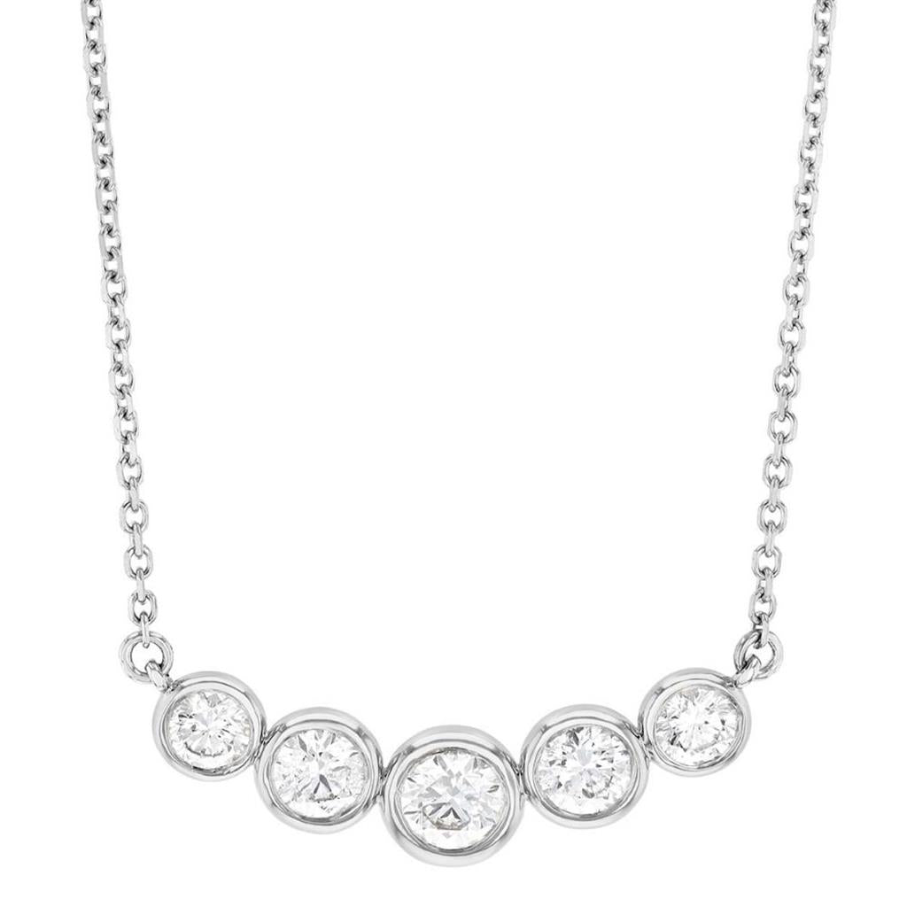 The Davis Luxe 14k White Gold Adjustable Curved Bar Design Diamond Pendant Necklace is a stunning and modern piece. This elegant necklace features five graduated bezel-set round brilliant cut diamonds, ranging from 3mm to 3.9mm, with a total diamond weight of 0.83 carats. The diamonds, with G color and SI1 clarity, radiate exceptional brilliance along the sleek curved bar design. The adjustable 16-18" chain allows for versatile wear, and the lobster clasp ensures a secure fit. Crafted in 14k white gold, this necklace adds a sophisticated touch to any ensemble, making it perfect for both everyday elegance and special occasions.