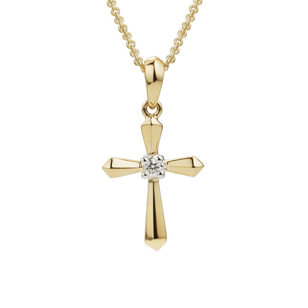 This elegant Davis Signature14k yellow gold necklace features a 13.5 x 10mm cross pendant with refined beveled edges, highlighting a single prong-set round brilliant-cut diamond at its center. Weighing 0.03 carats with G/H color and SI2 clarity, the diamond adds a touch of brilliance to this timeless design. Suspended on an adjustable 16-18" cable chain with a secure lobster clasp, this piece is a meaningful and sophisticated addition to any collection.