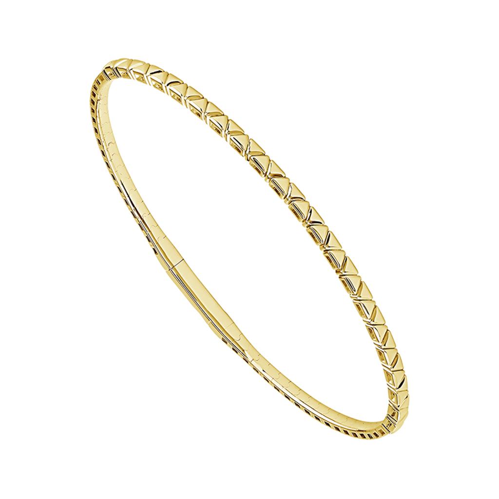 Striking and sculptural, this Flexie Collection bangle bracelet is crafted in 14k yellow gold with a flexible titanium wire core for effortless wear. Its sleek tracer silhouette is accentuated by bold triangular pyramid station detailing and secured with a discreet locking push clasp. A modern essential with a geometric edge.