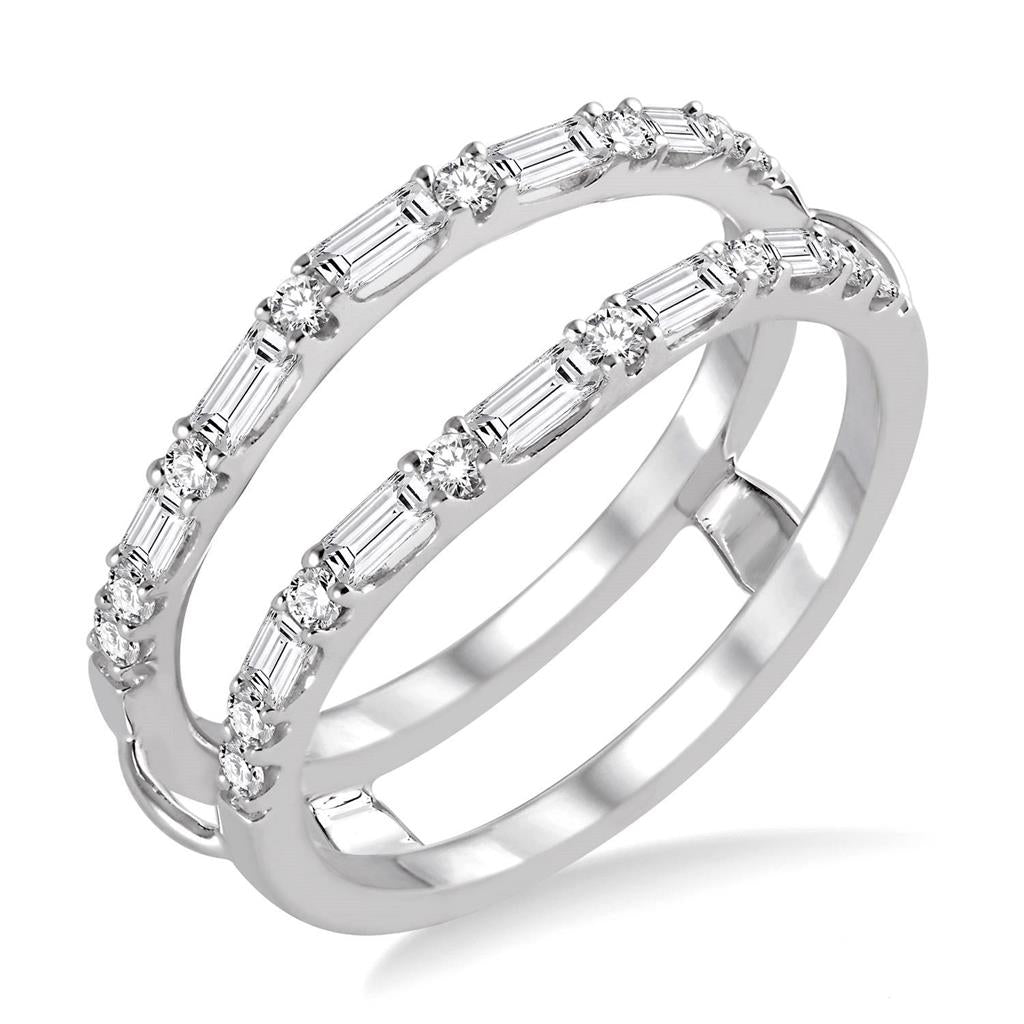 This elegant 14k white gold ring guard is designed to beautifully frame an engagement ring with refined brilliance and architectural balance. The design features 16 shared prong-set round brilliant-cut diamonds alternating with 10 shared prong-set baguette diamonds, creating a sophisticated interplay of sparkle and clean lines. Together, the diamonds total 0.55 carats and shimmer with G/H color and SI2–I1 clarity. Currently available in size 6.5, with other sizes available for special order upon request, this ring guard offers a timeless way to enhance and elevate a bridal set.
