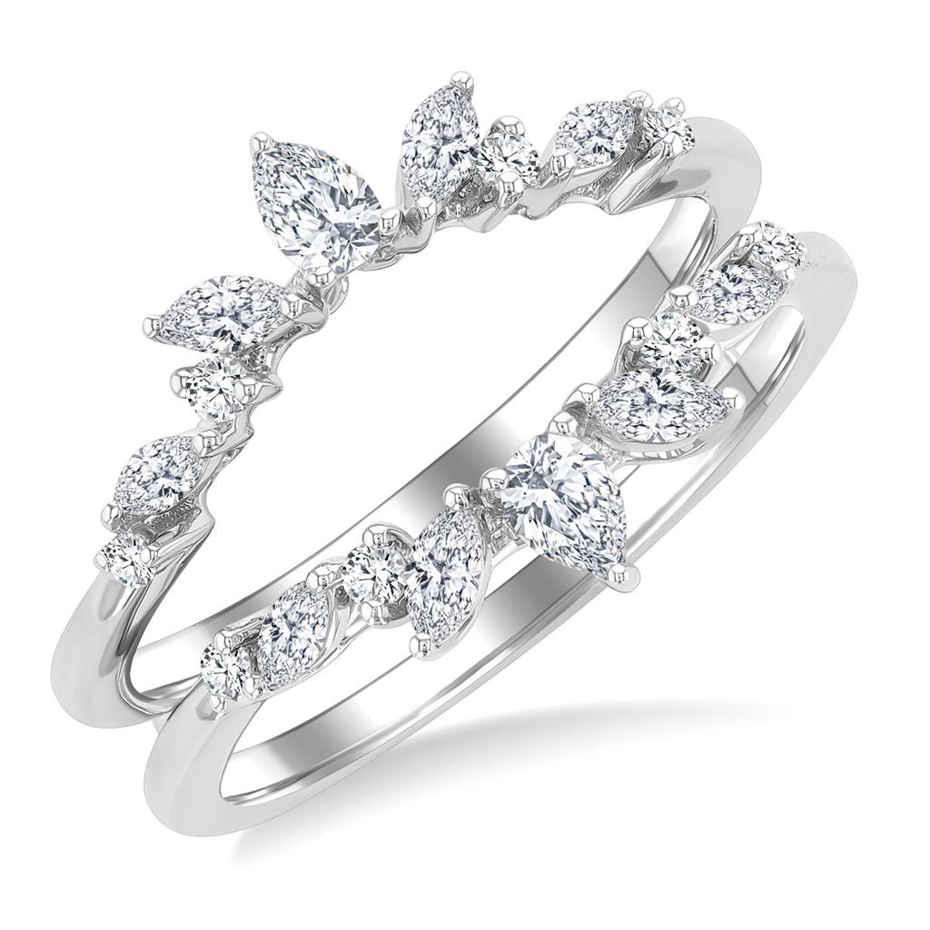 This distinctive 14k white gold ring guard features an artful mix of diamond shapes designed to beautifully frame an engagement ring. The design alternates eight prong-set round brilliant-cut diamonds with eight prong-set marquise diamonds, accented by two prong-set pear-shaped diamonds for added dimension and elegance. Together, the diamonds total 0.50 carats and display G/H color with SI2–I1 clarity, creating a dynamic balance of sparkle and shape. Currently available in size 6.5, with other sizes available for special order upon request, this ring guard offers a refined and expressive finishing touch to a bridal set.