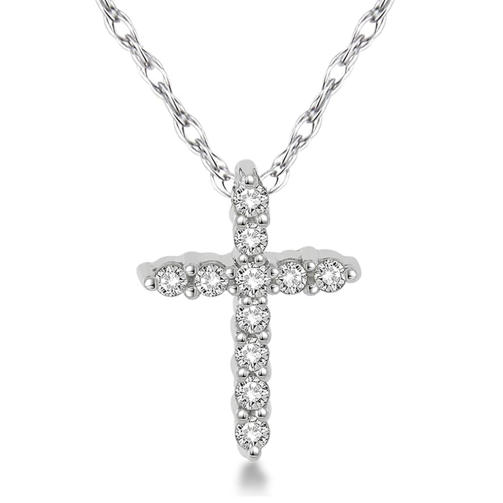 Delicate and timeless, this 14k white gold cross pendant is adorned with 11 shared prong-set round brilliant cut diamonds totaling 0.05 carats, with I/J color and SI2–I1 clarity. Suspended from an 18-inch chain and secured with a spring ring clasp, this elegant necklace offers a subtle yet meaningful sparkle, perfect for everyday wear or special occasions.