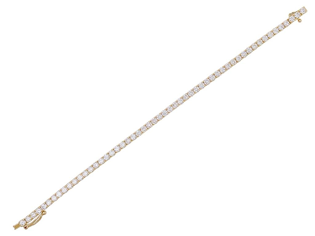 This timeless 14k yellow gold tennis bracelet is adorned with 64 round brilliant-cut diamonds totaling 4.02 carats. Each diamond is elegantly set in a secure 4-prong straight-line design, radiating with G/H color and SI clarity for a breathtaking display of sparkle. Measuring 7 inches in length, the bracelet is finished with a locking push clasp, blending classic luxury with everyday sophistication.