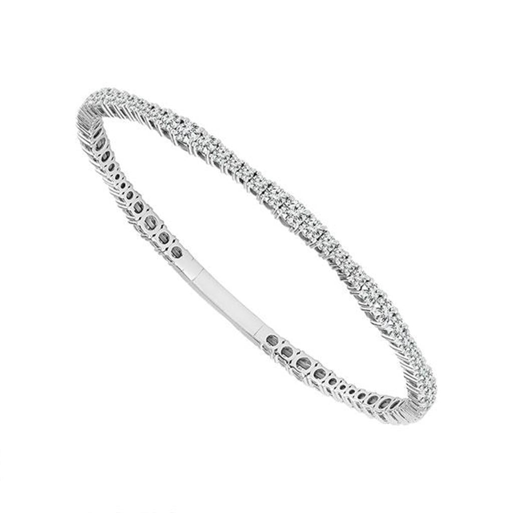 This stunning Davis Classics Flexie Collection bangle bracelet features a 14k yellow gold design with durable titanium wire for a flexible and comfortable fit. Adorned with 61 prong-set round brilliant-cut diamonds, totaling 5.63 carats, the bracelet showcases diamonds of G/H color and I1 clarity. Measuring 6.5" and secured with a locking push clasp, this piece blends innovation and elegance, making it a standout addition to any jewelry collection.