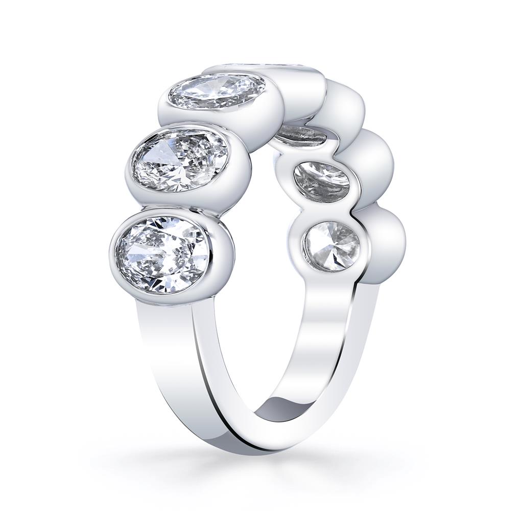 This sophisticated 14k white gold band features seven oval-cut diamonds measuring 5 x 3.5 mm and totaling 1.70 carats. Each diamond is bezel set in a north-south orientation, showcasing their graceful symmetry and captivating brilliance. The diamonds, with G/H color and VS1 clarity, create a refined sparkle that embodies timeless luxury. Perfect worn alone or stacked with other bands, this piece offers a modern yet classic expression of elegance. Currently available in size 6, with other sizes available for special order upon request.