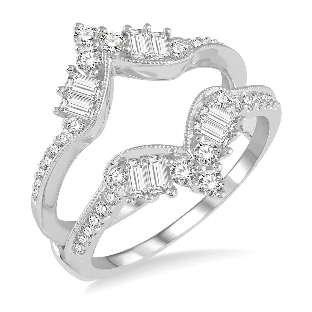 This elegant 14k white gold ring guard is designed to beautifully frame and elevate an engagement ring with refined brilliance. The design features eight prong-set baguette diamonds paired with 34 prong-set round brilliant-cut diamonds, creating a sophisticated balance of clean lines and radiant sparkle. Together, the diamonds total 0.81 carats and display G/H color with SI2–I1 clarity. Currently available in size 6.5, with other sizes available for special order upon request, this ring guard offers a timeless and polished finishing touch to a bridal set.