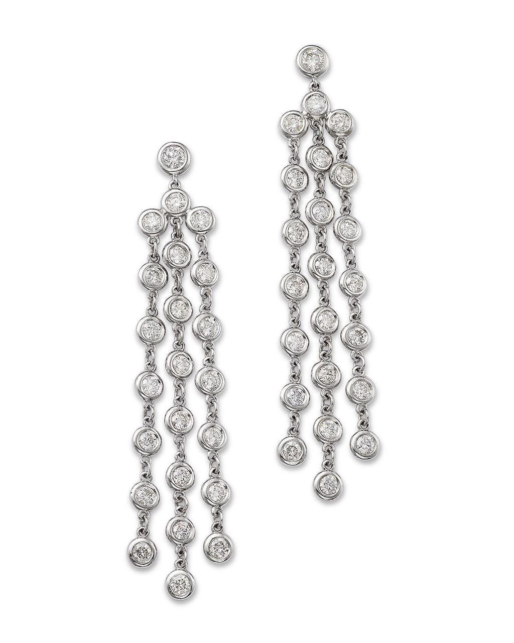 These luxurious Davis Classics 14k white gold dangle earrings feature a Diamond by the Yard triple-strand design adorned with 46 bezel-set round brilliant-cut diamonds, totaling 2.70 carats, with G/H color and SI1-SI2 clarity. Secured with friction posts and backs, these earrings bring graceful movement and radiant sparkle to any elegant ensemble.
