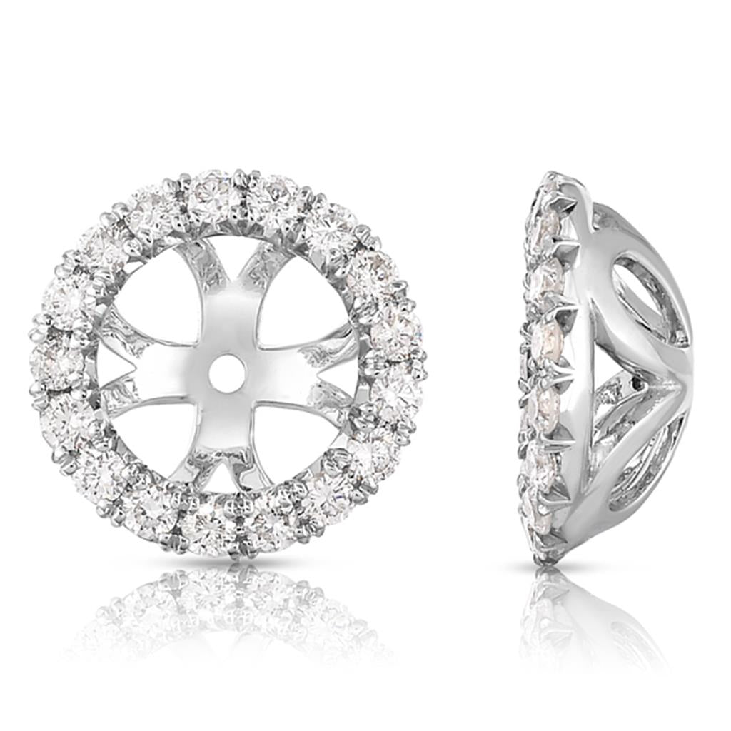 Elevate your stud earrings with these exquisite Davis Signature 14k white gold diamond earring jackets. Crafted to hold 4ctw round brilliant centers, they feature 38 prong-set round brilliant-cut diamonds, totaling 0.46 carats, with I/J color and SI1 clarity. These jackets create a radiant halo effect, adding an extra layer of brilliance and sophistication to your favorite earrings.