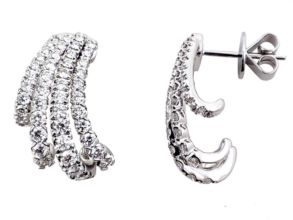 The Davis Classics 14k White Gold Multi-Row Diamond J-Hoop Design Stud Earrings are a stunning combination of brilliance and contemporary style. These luxurious earrings feature a unique J-hoop design, adorned with 90 prong-set round brilliant cut diamonds, totaling 1.70 carats. With G/H color and VS1-VS2 clarity, the diamonds offer exceptional sparkle and radiance, beautifully set against the sleek 14k white gold. Secured with friction posts and backs for comfort and security, these multi-row diamond earrings are perfect for adding a touch of elegance to both everyday wear and special occasions. A chic and timeless addition to any fine jewelry collection.