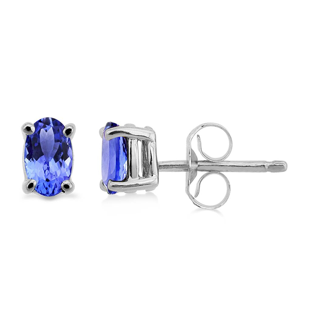 These timeless Davis Classics 14k white gold stud earrings feature two captivating oval-cut Tanzanite gemstones measuring 5mm by 3mm, prong-set to showcase their vibrant allure. Designed with friction posts and backs for secure and comfortable wear, these solitaire earrings bring a touch of refined elegance to any ensemble.