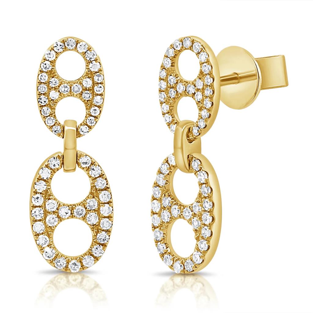 Elevate your style with these stunning 14k yellow gold diamond link dangle earrings from Davis Classics. Measuring approximately 3/4 inch, each earring features 50 pave-set round single-cut diamonds totaling 0.25 carats, with G/H color and SI1 clarity. These earrings are designed with secure locking push clasps, offering a chic yet timeless elegance suitable for all occasions.