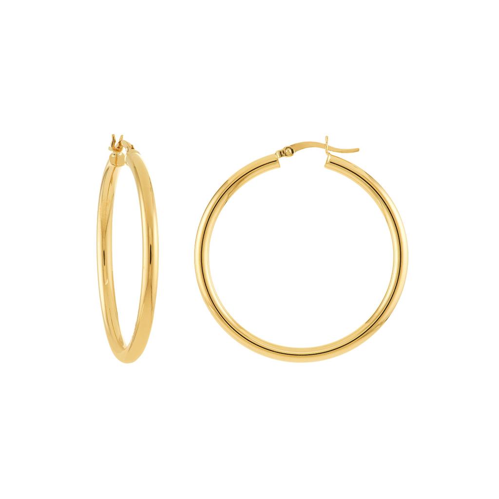 These Davis Classics hoop earrings feature a classic rounded tubular design in 14k yellow gold, measuring 3 x 40mm. With a high-polished finish and secure locking lever clasps, these versatile hoops exude timeless elegance, perfect for elevating any look.