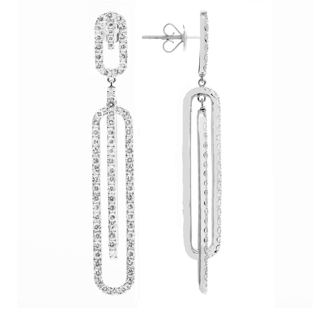 These striking Davis Classics 18k white gold dangle earrings feature a modern interlocked paperclip design adorned with 166 prong-set round brilliant-cut diamonds, totaling 4.10 carats, with G/H color and SI1 clarity. Secured with friction posts and backs, these earrings make a bold and glamorous statement, perfect for elevating any sophisticated ensemble.