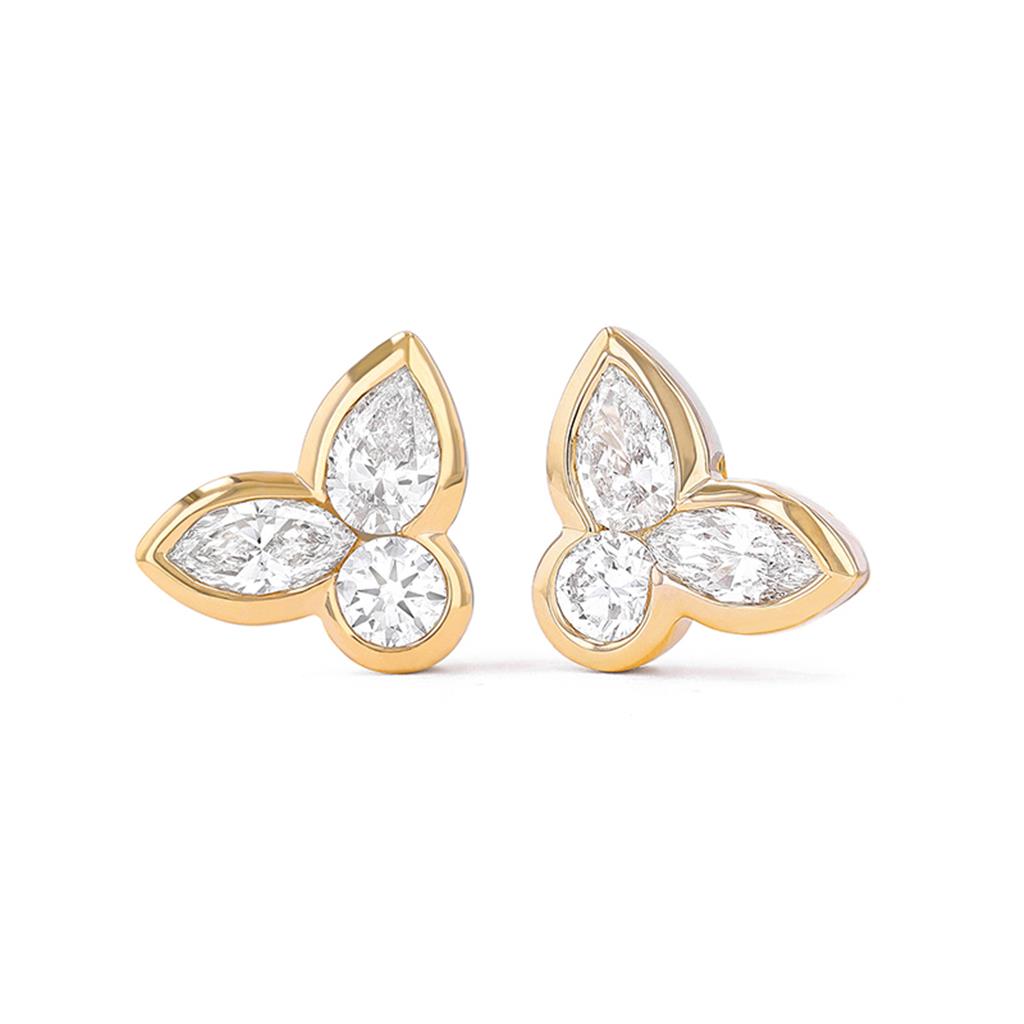 These exquisite floral diamond stud earrings from the Davis Classics Couture Duchess Collection are crafted in 18k yellow gold. Showcasing a captivating blend of shapes, each earring contains (1) bezel set round brilliant cut diamond, (1) bezel set pear cut diamond, and (1) bezel set marquise cut diamond, together totaling 1.00ctw of F/G color, VS2-SI1 clarity. Secured with friction posts and backs, this floral design brings an elegant and timeless touch to any occasion.