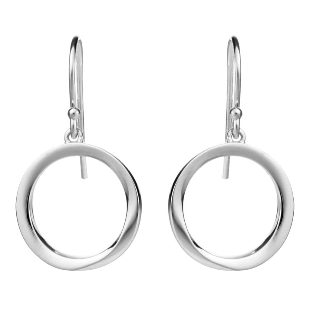 Crafted in sterling silver with a luminous rhodium finish, these elegant dangle earrings feature a cut-out open circle design that exudes modern sophistication. Their airy silhouette captures light beautifully, while French hooks provide both comfort and secure wear. A versatile pair, they transition effortlessly from everyday elegance to evening refinement.