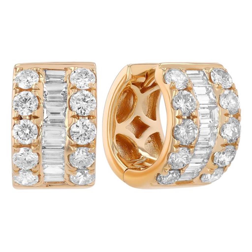 Crafted in radiant 18k yellow gold, these diamond huggie hoop earrings feature a dazzling display of brilliance and sophistication. Fourteen channel-set baguette-cut diamonds, weighing a total of 0.61 carats and graded G/H color with SI1 clarity, form a sleek, geometric centerline. Accenting this luminous core are twenty prong-set round brilliant-cut diamonds totaling 0.81 carats, also G/H color and SI1 clarity, adding a soft sparkle to the bold silhouette. Finished with secure hinged locking full-closure clasps, these earrings are a timeless expression of elegance.