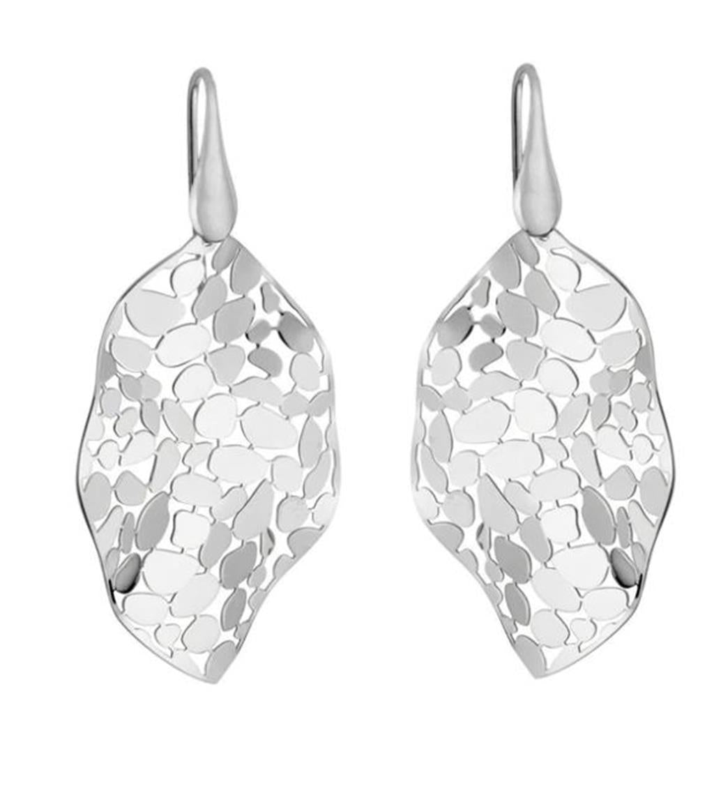 These elegant sterling silver dangle earrings feature a delicate 64.5mm mosaic leaf design, beautifully crafted with a rhodium finish for lasting brilliance. Suspended from French hooks, these statement earrings offer a graceful and nature-inspired touch to any jewelry collection.