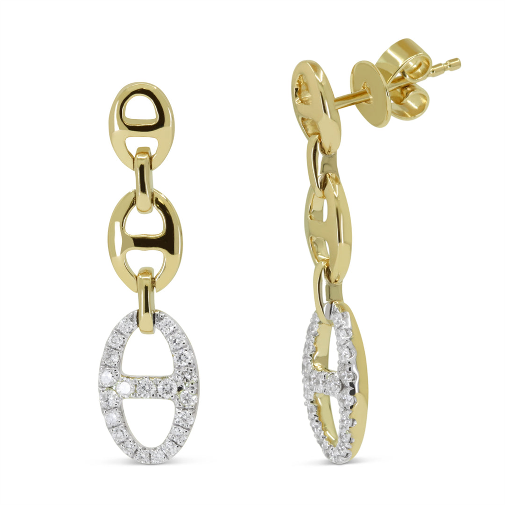 Illuminate your style with the Davis Signature 14k Yellow Gold Link Design Diamond Drop Earrings. These captivating earrings feature 42 pave-set round brilliant cut diamonds, totaling 0.33 carats, with G/H color and SI2 clarity, elegantly set in a graceful link design. The friction posts and backs ensure a secure and comfortable fit. Perfect for adding a touch of refined sparkle to any ensemble.