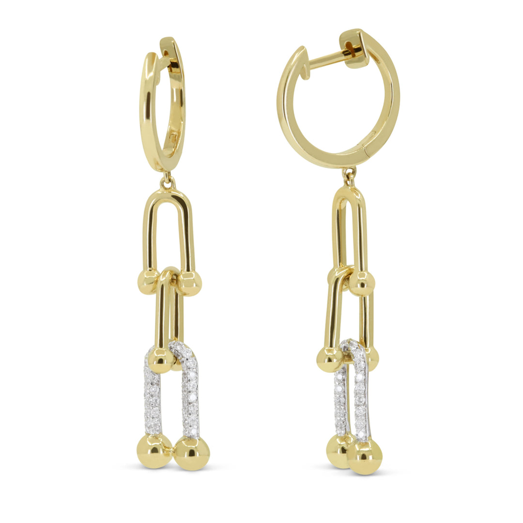 Elevate your style with the Davis Signature 14k Yellow Gold Triple Link Diamond Drop Earrings. These stunning earrings showcase three linked segments, each adorned with 28 prong-set round single cut diamonds totaling 0.25 carats, with G/H color and SI2 clarity. The design is completed with secure locking full closure clasps, ensuring both elegance and comfort. Perfect for adding a touch of sophistication to any outfit, these earrings are a must-have for your jewelry collection.