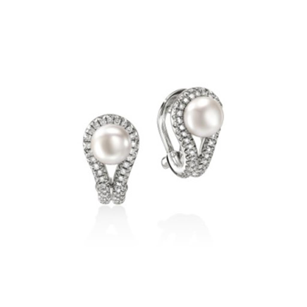 John Hardy Pearls and Diamond Huggie Hoop Earrings in Sterling Silver. White Fresh Water Pearl, Size: 6mm - 6.5mm.