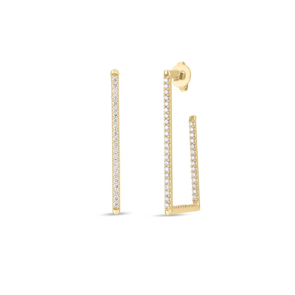 Elevate your elegance with the Roberto Coin 18k Yellow Gold Perfect Diamond Hoops Collection. These 35 x 20mm small rectangular In/Out diamond hoop earrings feature 90 shared prong set round brilliant cut diamonds totaling 1.23 carats, with G/H color and SI1 clarity. Secured with friction post backs, these earrings combine luxurious design with impeccable craftsmanship, making them a stunning addition to any jewelry collection. Style # 000631AYERX0.