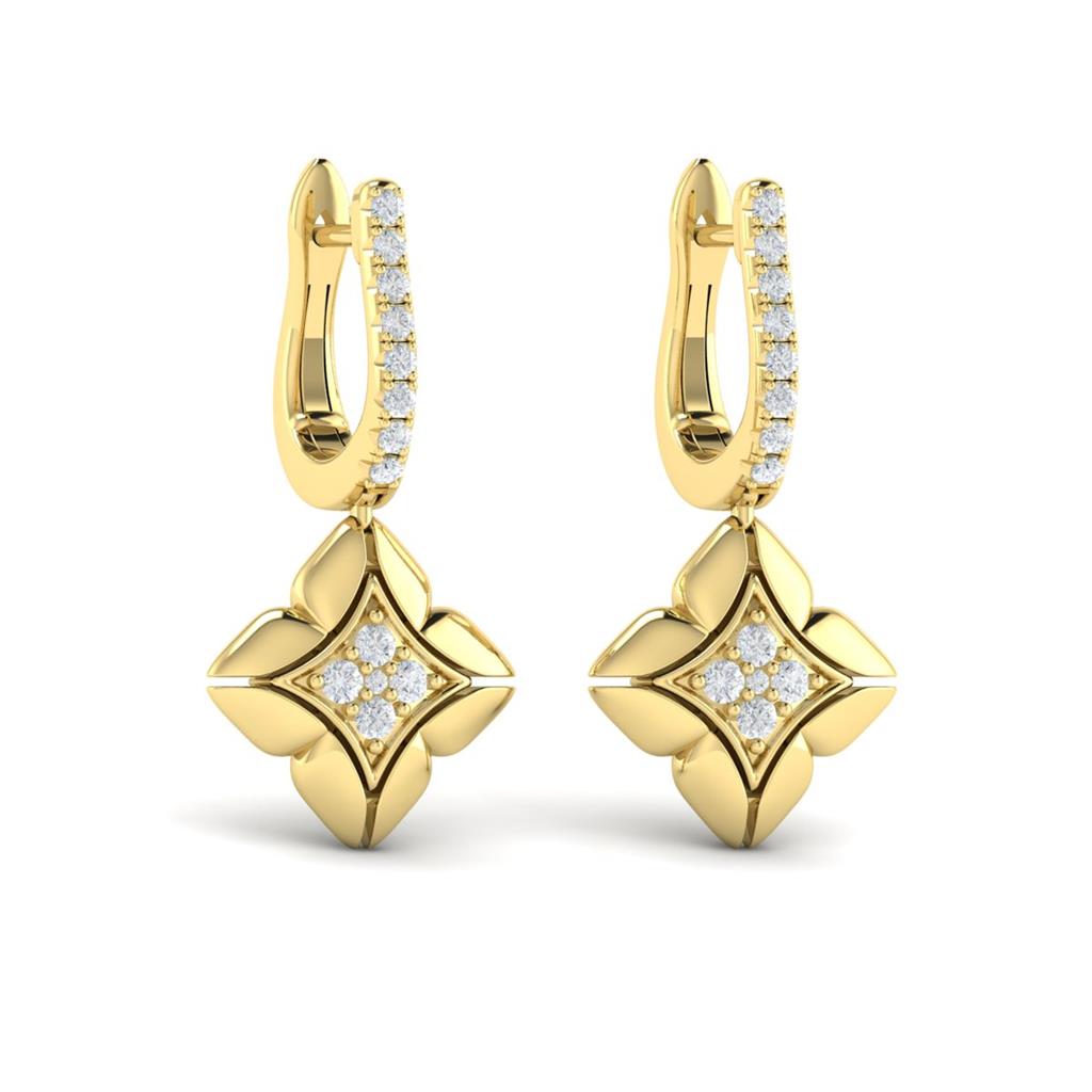 Elevate your elegance with the Vlora 14k Yellow Gold Estrella Collection. These floral quilt motif drop earrings feature 26 pave set round brilliant cut diamonds totaling 0.31 carats, with G color and VS2-SI1 clarity. Secured with locking lever backs, these earrings combine intricate design with exquisite craftsmanship, making them a stunning addition to any jewelry collection.