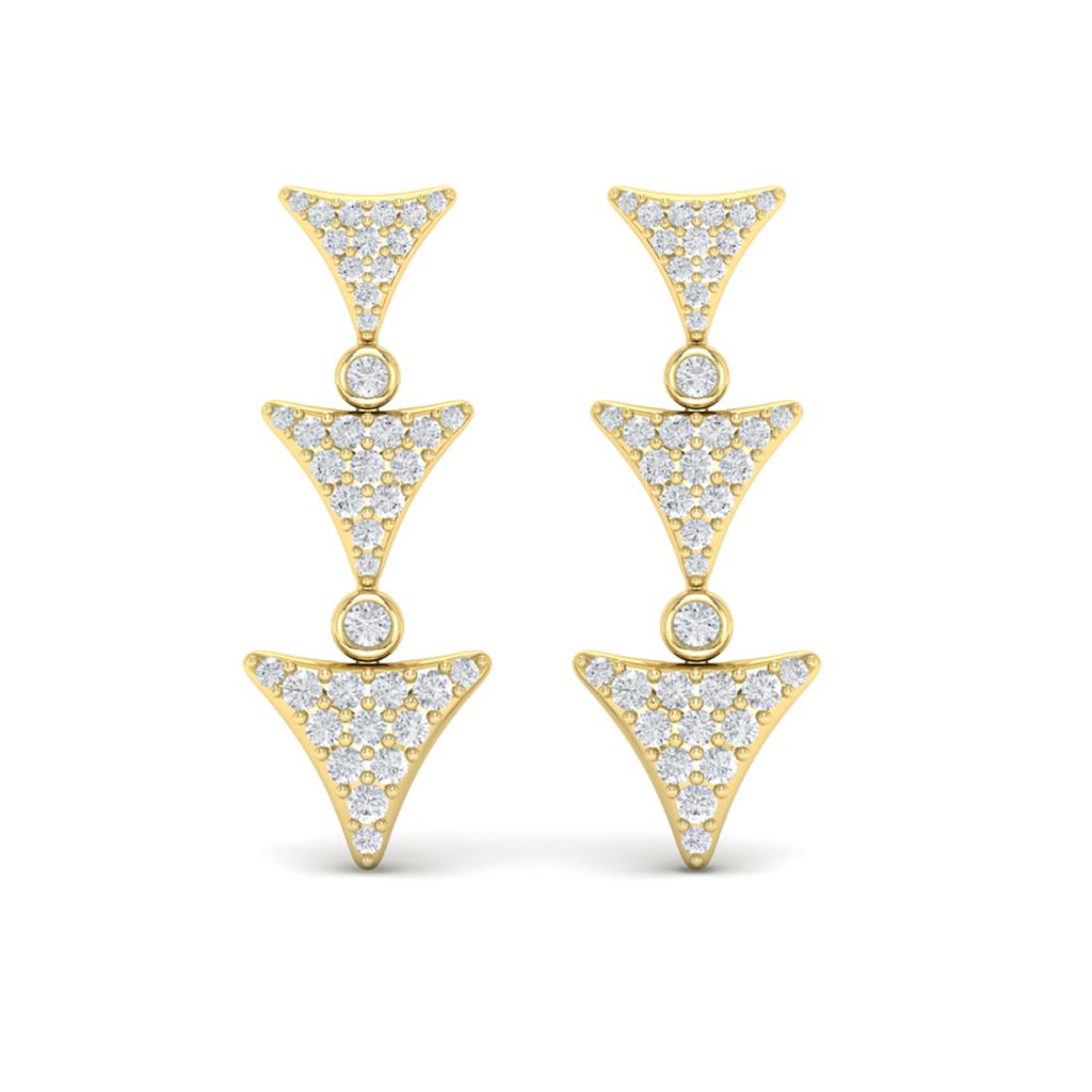 Add a touch of glamour with the Vlora 14k Yellow Gold Miravel Collection. These triple drop inverted triangle earrings feature 52 prong set round brilliant cut diamonds totaling 0.68 carats, with G color and VS2-SI1 clarity. Secured with friction posts and backs, these earrings combine modern geometric design with exquisite craftsmanship, making them a stunning addition to any jewelry collection.