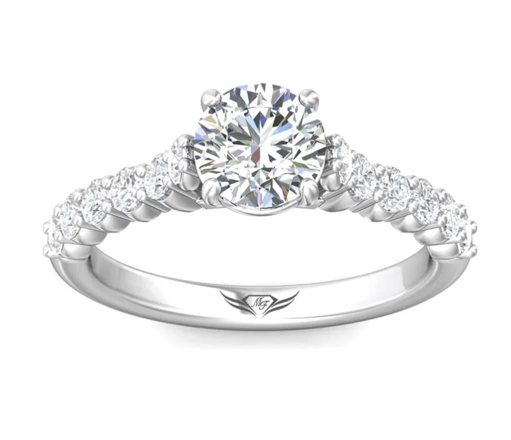 This elegant Martin Flyer 14k white gold FlyerFit cathedral design engagement ring setting features 12 shared-prong set round brilliant cut diamonds, totaling 0.56 carats, with H color and SI2 clarity. Designed to hold a 6.5mm round brilliant center stone, the cathedral setting offers timeless sophistication and beauty. Available in size 6.5, with other sizes available upon request. Please note that the price is subject to change based on finger size, metal preference, and desired center stone size. The price does not include the center stone.