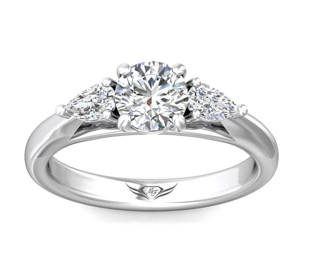 Martin Flyer Three Stone Diamond Engagement Ring Setting in 14k White Gold. Finger size 6.5 in stock, additional sizes available for special order. Pricing does not include center stone.