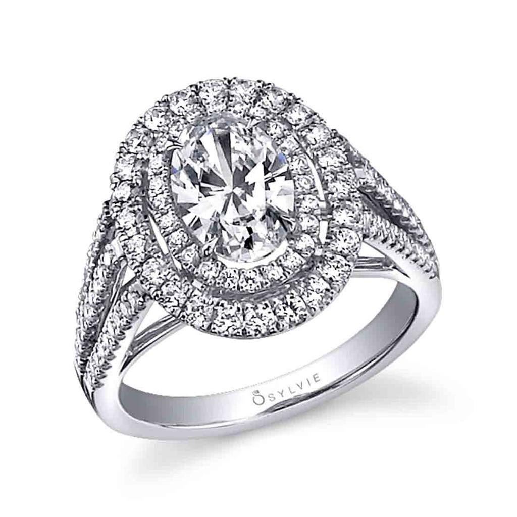 This glamorous engagement ring setting from Sylvie is crafted in 14k white gold with an intricate double halo design. Made to hold an 8mm oval cut center stone of your choice, it is framed by 22 prong-set round brilliant cut diamonds in the inner halo and 22 more in the outer halo. Additional brilliance comes from 22 bead-set round brilliant cut diamonds in the milgrain-detailed gallery and 54 prong-set round brilliant cut diamonds cascading along the double V-split shank. Altogether, the accent stones weigh 1.11 carats, graded G/H color with SI1 clarity, creating a breathtaking display of sparkle and elegance. This ring is currently available in size 6.5, with other sizes available for special order upon request.