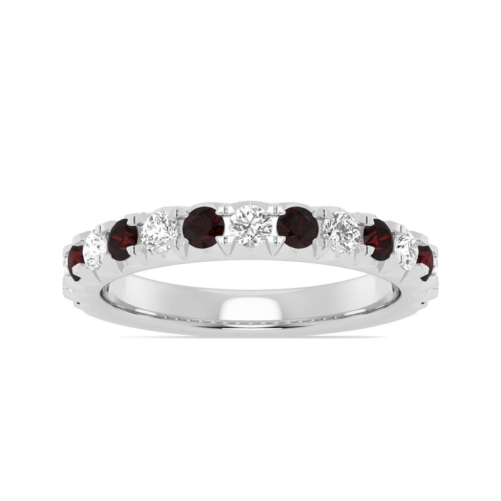 Embrace timeless beauty with this 14k white gold stackable birthstone band, showcasing seven fishtail prong-set round genuine Garnets measuring 2.2mm. Their rich, fiery red tones are elegantly paired with six alternating fishtail prong-set round brilliant cut diamonds, totaling 0.25ctw of G/H color and SI1-SI2 clarity. Crafted in a finger size 6, this versatile piece is perfect for stacking or as a striking standalone accessory.