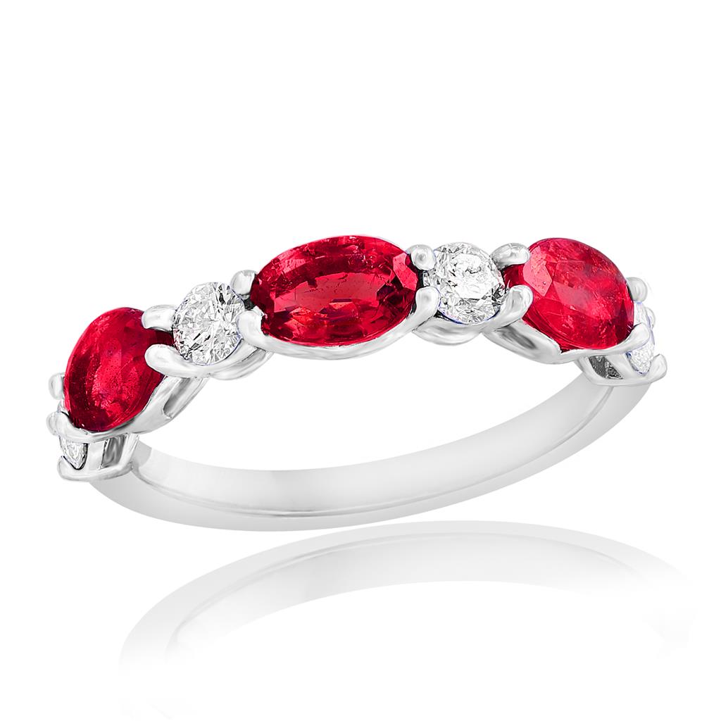 This elegant 14k white gold fashion band features three East-West shared prong-set natural oval-cut Mozambique rubies, totaling 1.71 carats, alternating with four shared prong-set round brilliant-cut diamonds, weighing 0.61 carats with G/H color and SI1-SI2 clarity. A timeless blend of bold color and sparkling brilliance, this band is perfect for stacking or wearing alone. Currently available in size 6.5, with other sizes available for special order upon request.