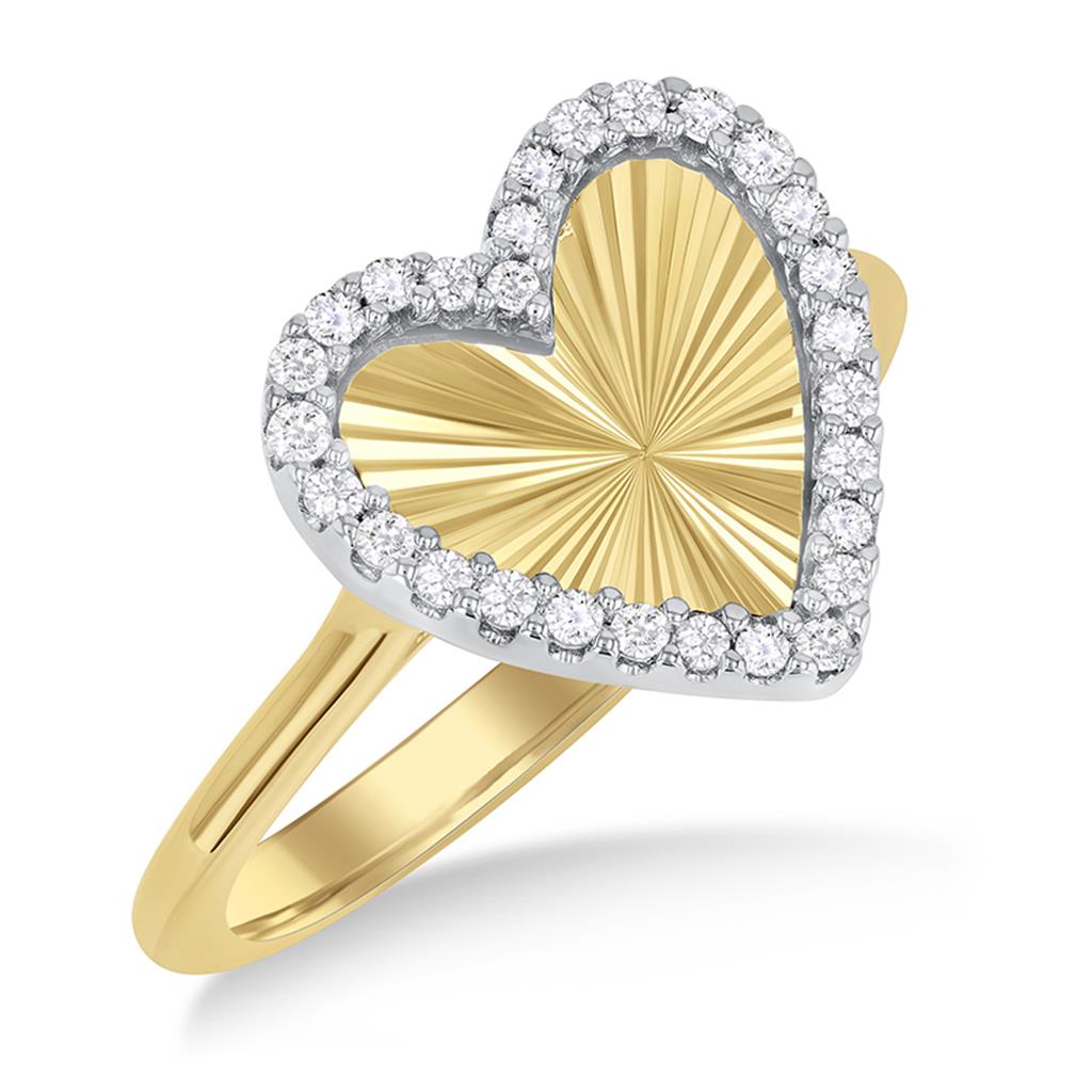 This exquisite 14k yellow and white gold fashion ring features a charming fluted heart design encircled by a dazzling halo of 28 prong-set round brilliant-cut diamonds, totaling 0.15 carats with I/J color and SI2-I1 clarity. Currently available in size 7.25, with other sizes available for special order upon request, this ring is a timeless symbol of elegance and romance.